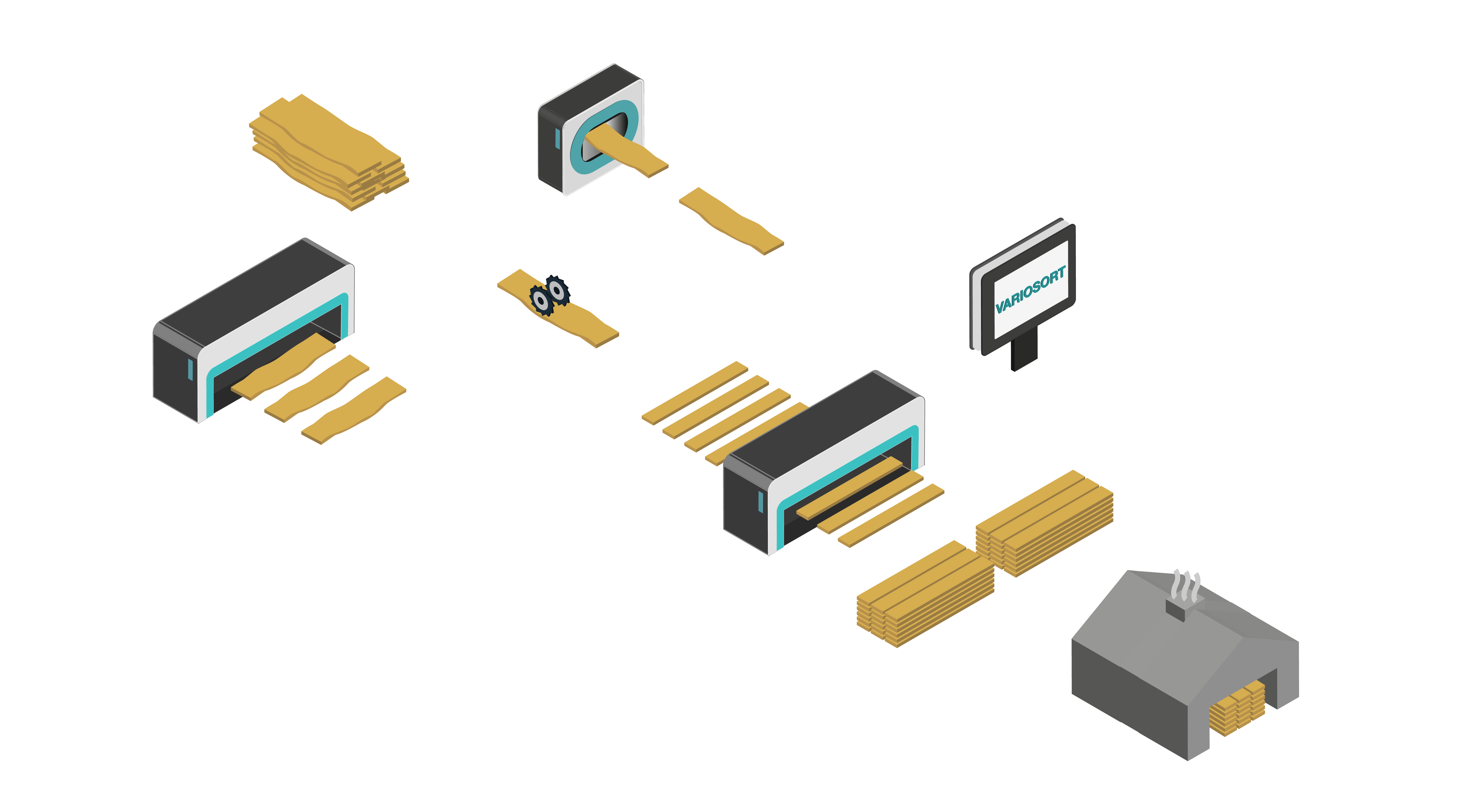 Our high-precision multi-sensor transverse quality Goldeneye scanner is used in green mills to grade and sort rough green lumber. The Variosort Control Suite supervises this process, with additional inline components for added value.