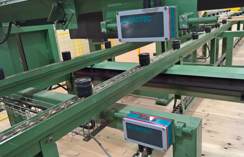 The PLC programming and controls in the logyard and at the sawline infeed are from Microtec. The saw infeed consists of a high speed infeed deck with integrated waste removal system, to feed-in the EWD reducer chipper-canter / twin bandsaw line at highests speeds. Four Logeye 3D scanners are combined with the Maxicut software to enable a breakdown of the logs according to predefined best fitting cutting patterns. The Screenlog system delivered by Microtec performs a very specific task, to visually detect the pith at the top/butt of the logs. For the green-sorter line two high precision Microtec Endscan scanners detect the cup, pith and the appearance of the annual rings on both ends of the board. Boards with visual pith on the ends are sorted out to another bin. The Variosort program is combined with the measurement of length, width and thickness.