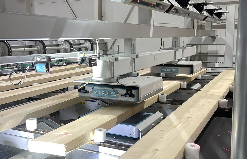 The two Goldeneye scanners, which are used in both the glulam plant and the planing mill, are the heart of MiCROTEC’s scope of delivery. “With the upstream Viscan, the two Goldeneye scanners at Cordes are built to have the maximum configuration,” Creuzberger explains. This way, all available channels are used to detect any wood defects and grade the wood’s strength reliably and accurately. On its inside, the Goldeneye scanner is equipped with color cameras, 3D cameras for determining board dimensions, and laser scatter cameras with run-through point lasers for the precise detection of knots and grain deviations.