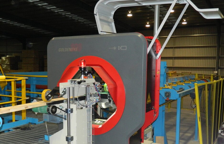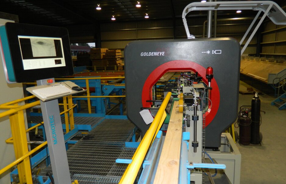 In this challenge for modernization, a brand new Multi-Sensor Quality Scanner Goldeneye 300 has been installed in April 2015 at the Te Kuiti site of Tregoweth Ltd. The scanner application provides automatic quality grading of the lamellas by scanning all 4 sides in longitudinal feeding, in a single cross cut line from Dimter. The application is a full profile scanning and grading of raw lamellas for components and finger jointing, which are produced using sawn timber from pruned radiata logs. The in feed and out feed unit of the scanner is provided by System TM. The boards are dry and planed and ideally possess clear wood sections. Kevin Tregoweth, managing director, states with satisfaction: ”We are impressed with the grade recovery increase provided by the Goldeneye scanner and re-ripping application”.