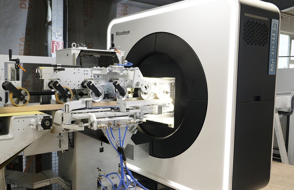 Another special feature of the machine installed at Hohmann Holzindustrie is the possibility to have a mix of widths. During production, elements of different widths pass through the scanner one after the other without the need to change any settings. “The infeed unit automatically scans the width of the elements. Then, the lateral camera inside the scanner moves within a few milliseconds. At the time, Hohmann was one of the first customers for whom we integrated this technology into the scanner,” Hagnberger recalls.