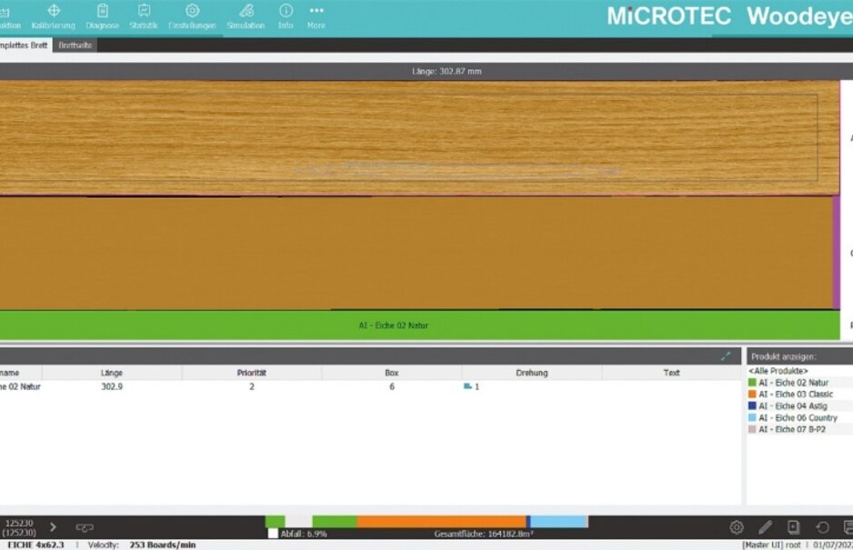 Artificial intelligence also ran from day one. During the past months, the algorithm for artificial intelligence was made even more robust by MiCROTEC Linköping. This means that the slats have different characteristics depending on their origin. Nevertheless, they all have to be placed in a suitable sorting class. "The scanner now works very well. The uniformity of the overall appearance has improved significantly and the re-sorting of the oak slats has been eliminated," reports production manager Winfried Konrad.
